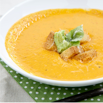 When serving the soup, garnish with croutons and a dollop of the pesto cream cheese topping. Serve immediately and enjoy!